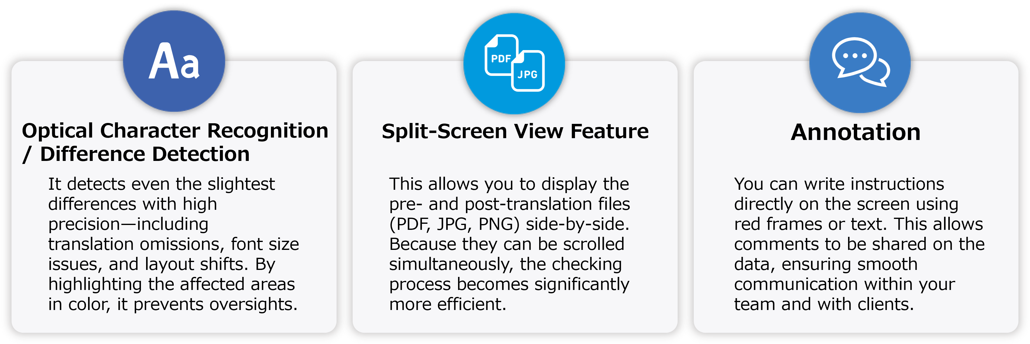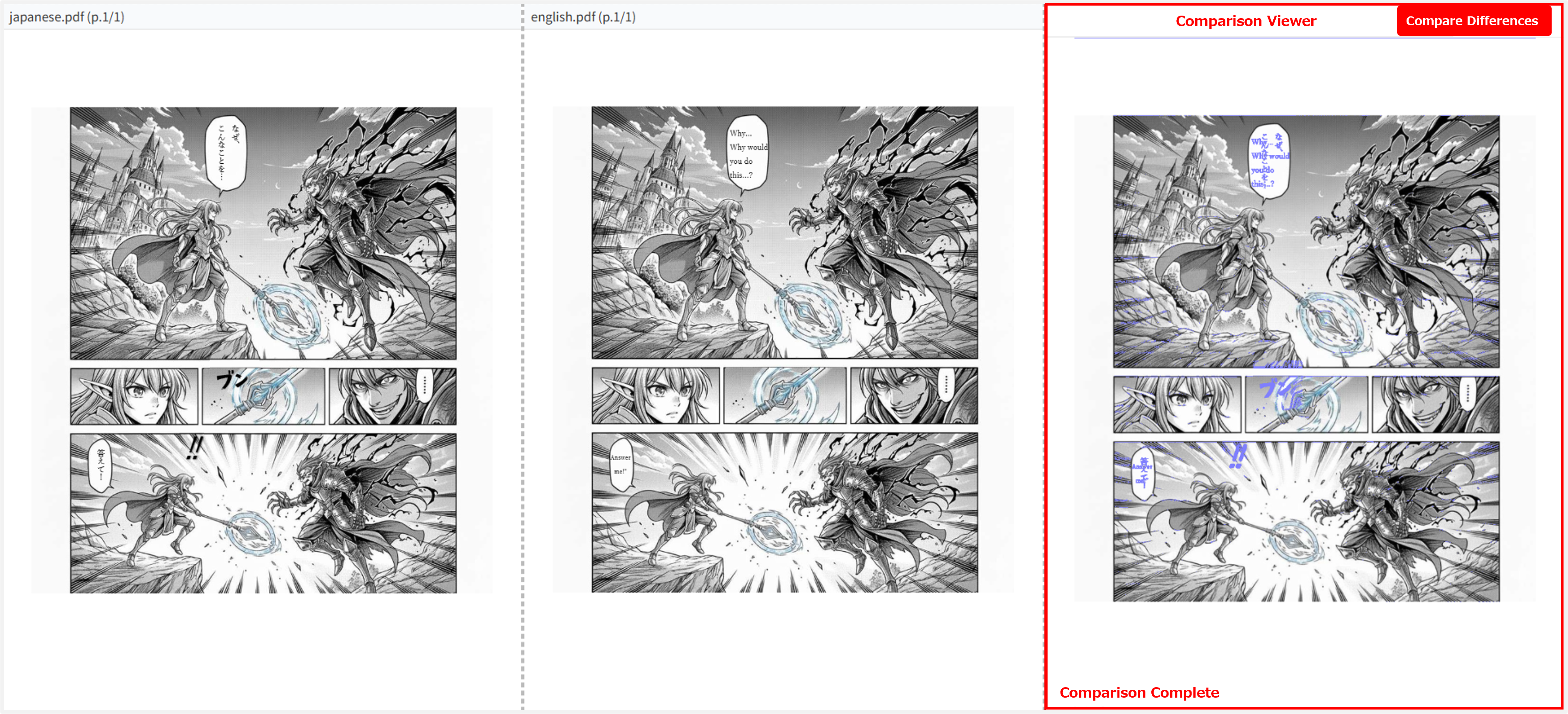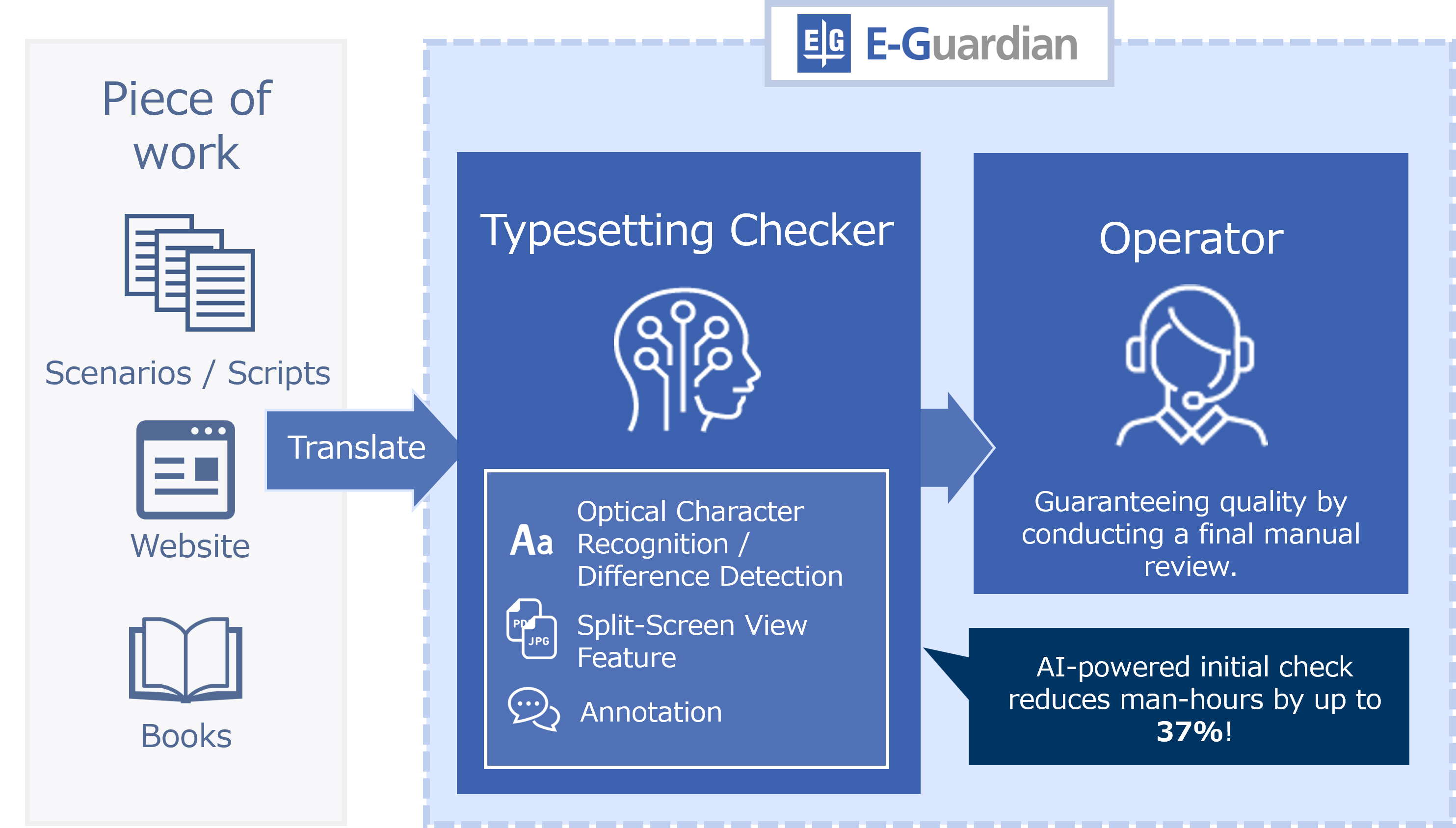 "Typesetting Checker" is a high-precision, AI-powered multilingual content quality check tool. By comparing pre- and post-translation files (PDF, JPG, PNG, etc.), it detects even the slightest differences, such as typos, omissions, and layout corruption, ensuring nothing is missed. It can be used for quality control across all media, including manga, anime, websites, apps, and books. Furthermore, when used in conjunction with our generative AI translation system, "EG Trans Works" ,you can build a seamless, end-to-end workflow from content translation through to quality control.