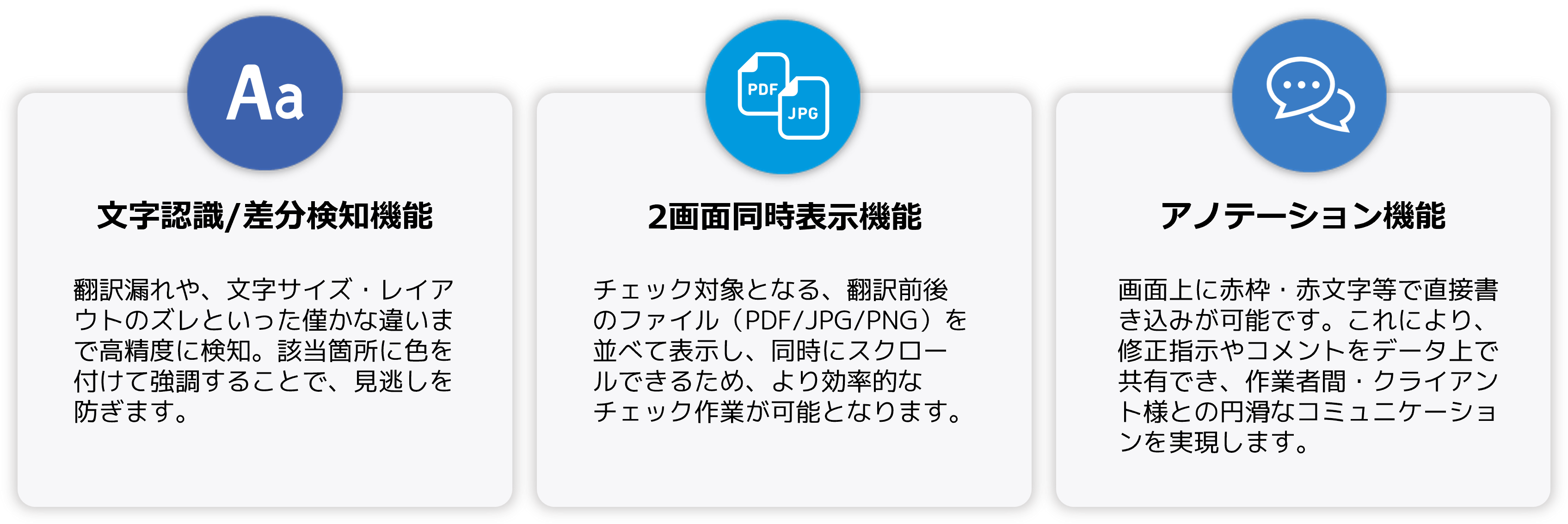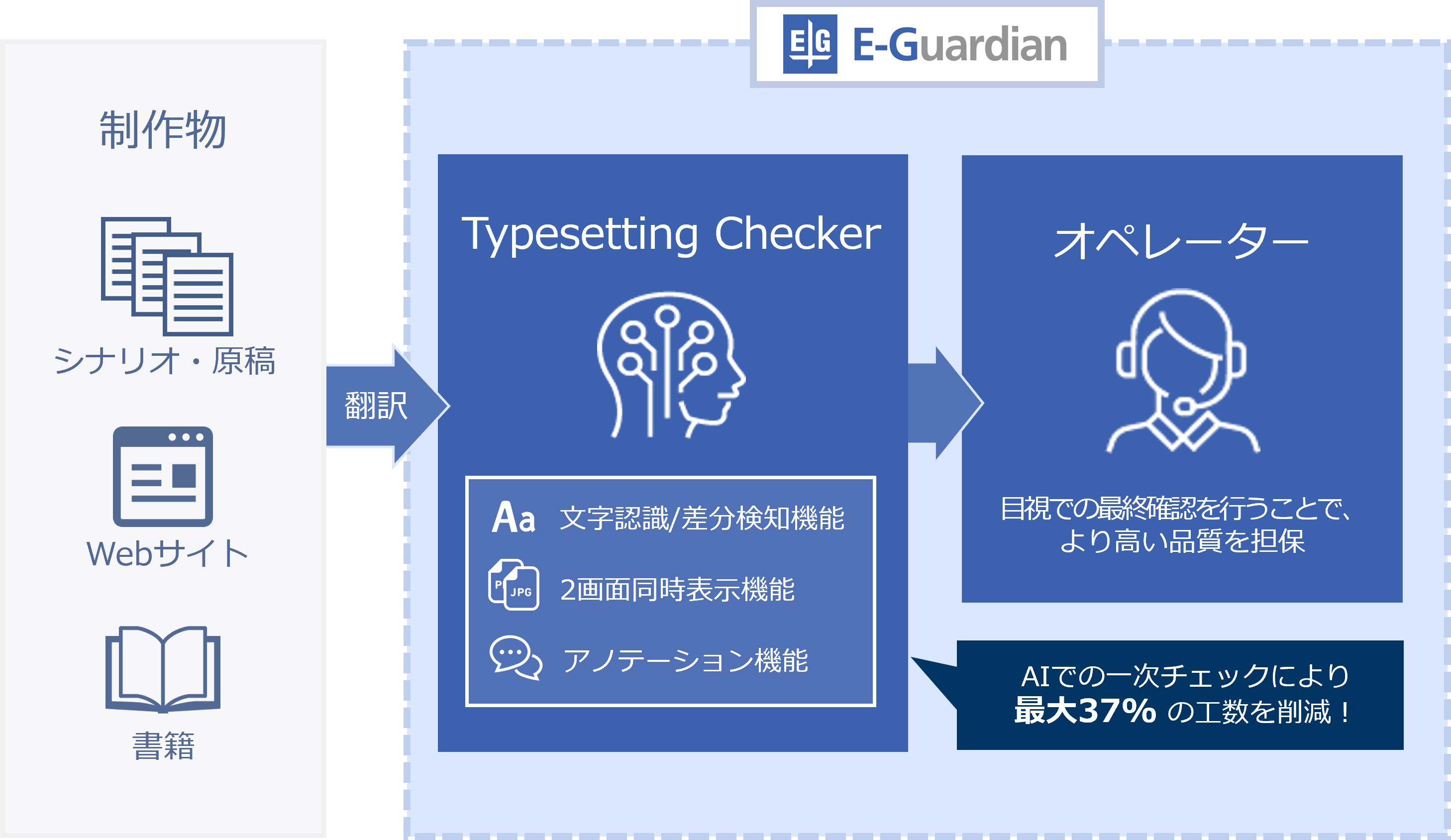 「Typesetting Checker」は、翻訳前後のファイル(PDF/JPG/PNGなど)を比較し、誤字脱字や表示崩れといった僅かな違いを逃さず検知する、AI搭載型の高精度な多言語コンテンツ品質チェックツールです。漫画やアニメ、Webサイト、アプリ、書籍まで、あらゆる媒体の品質管理にご活用いただけます。さらに、生成AI翻訳システム「EG Trans Works」と併用いただくことで、コンテンツの翻訳から品質管理まで、一気通貫のワークフロー構築が可能となります。