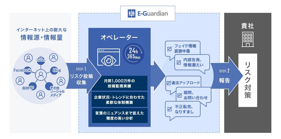 企業にとって大きなリスクとなる、インターネット上の“炎上”や“風評被害”。素早く防ぐには、SNSやブログ、動画サイト、口コミサイトなどをくまなくチェックし、『リスク投稿』を早期に発見する必要があります。 月間2,000万件以上の監視実績を持つイー・ガーディアンでは、「AI×人」による高精度かつ効率的な監視で『リスク投稿』を検知し“10分以内”にご報告、監視体制の強化や初動のアドバイスなど炎上対策で特に重要となる「最初の1時間・8時間」に向けたサポートを行います。 お客様のご要望に基づき、情報漏えいやフェイク情報・誹謗中傷対策といった様々な観点で監視キーワードを設定し『リスク投稿』を収集。お客様のご状況や社会的トレンドの変化に合わせ、監視キーワードの変更や監視体制の調整をタイムリーに行うなど柔軟な対応も可能です。さらに、収集したリスク投稿を分析し、過去事例をもとにした対処方法のアドバイスなどもご提案させていただきます。
