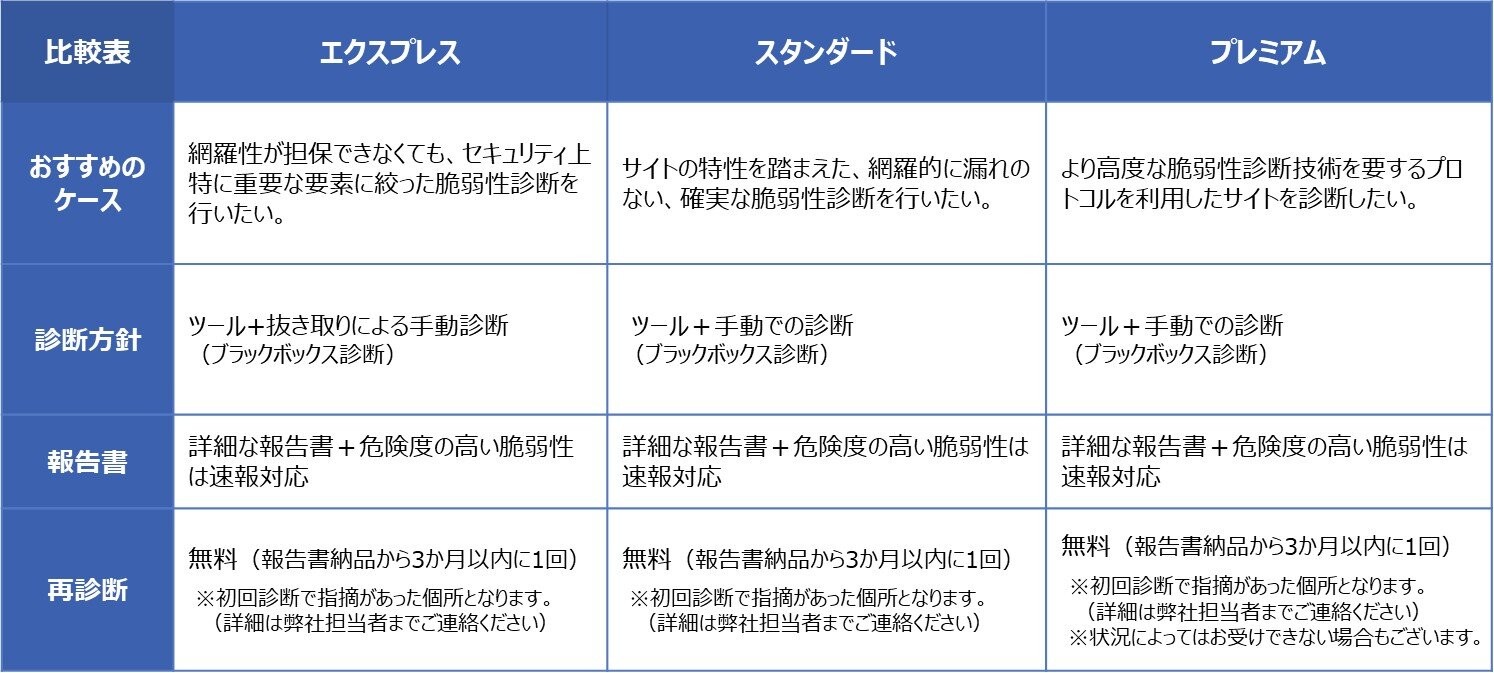 自動診断ツールと専門家による手動診断を組み合わせた網羅性の高い標準プランです。「安全なウェブサイトの作り方」「OWASP TOP10」の項目に沿った高精度な診断を行います。